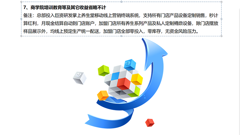 开发权,经营权,招商权,跨区域推荐权及总公司项目优先入股权。创新互联网+大健康养生,线上+线下+商圈模式。
